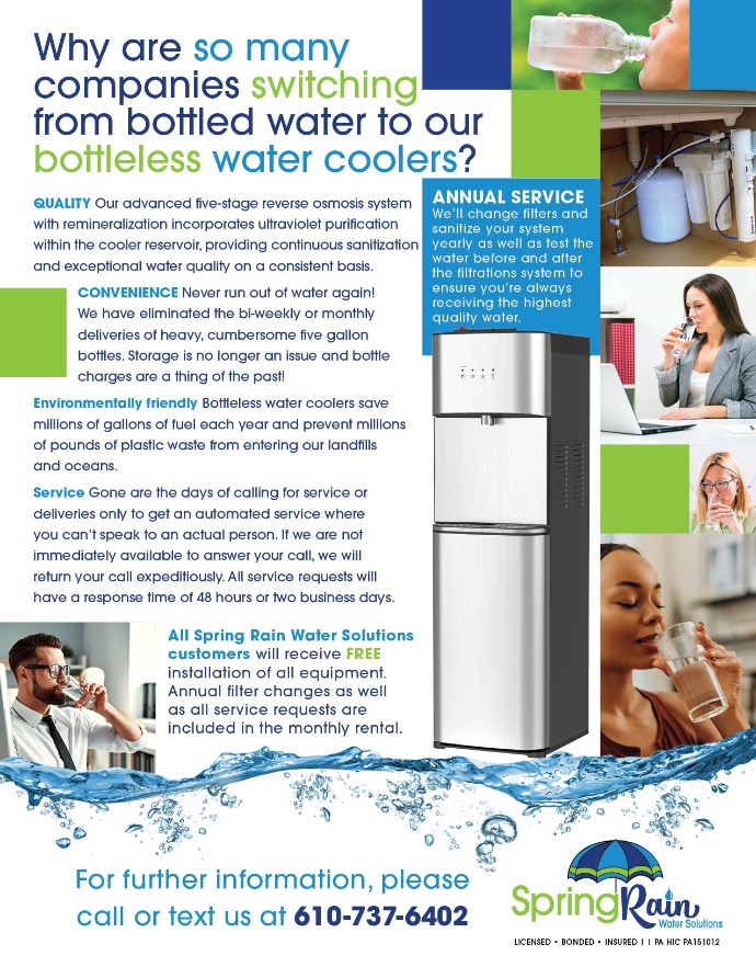 Never run out of water again! We have eliminated the bi-weekly or monthly deliveries of heavy, cumbersome, five-gallon bottles. Storage is no longer an issue and bottle charges are a thing of the past!